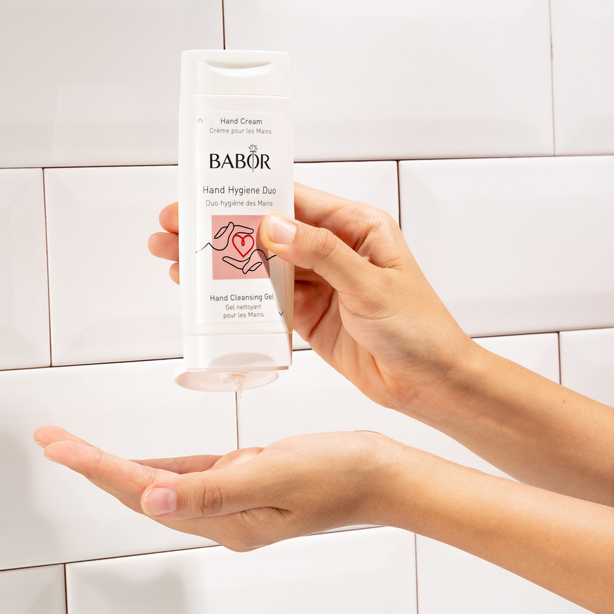 Сначала нанесите небольшое количество геля для очистки рук на ладони и втирайте, пока гель не впитается. Теперь можно обильно нанести крем для рук и промассировать.