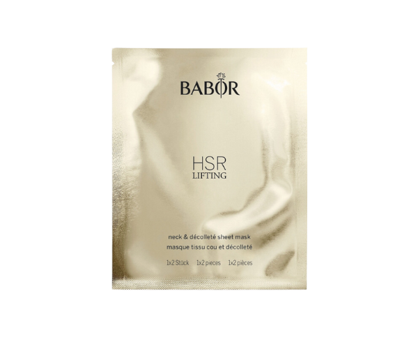 Нанести крем-маску на лицо, открыть пакет Babor HSR Lifting Face Sheet Mask + Neck & Decollete Sheet Mask, вытянуть маску и разместить её на лице, шеи и зоне декольте.