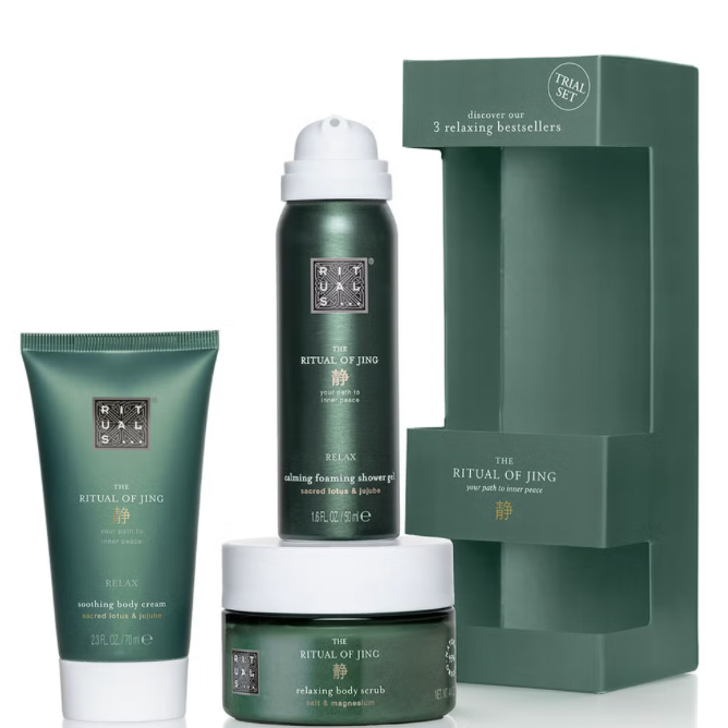 - The Ritual of Jing Relax Soothing Body Cream (70 мл): Крем для тела с уникальной формулой, включающей экстракт лотоса и риса, нежно увлажняет и питает вашу кожу, делая ее мягкой и шелковистой.